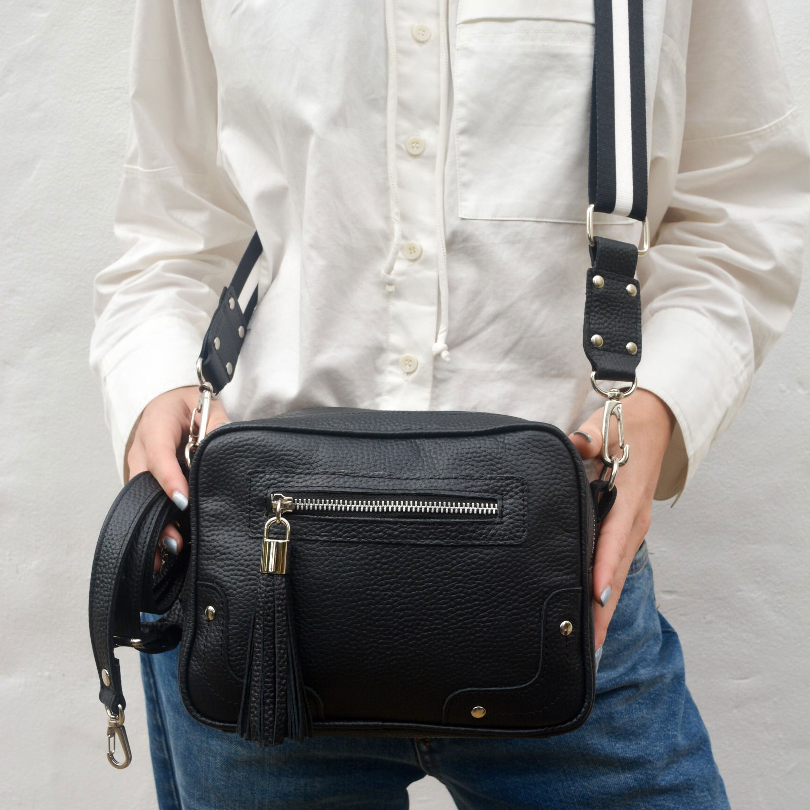Doble Correa larga desmontable: una de cuero y una de cinta rayada