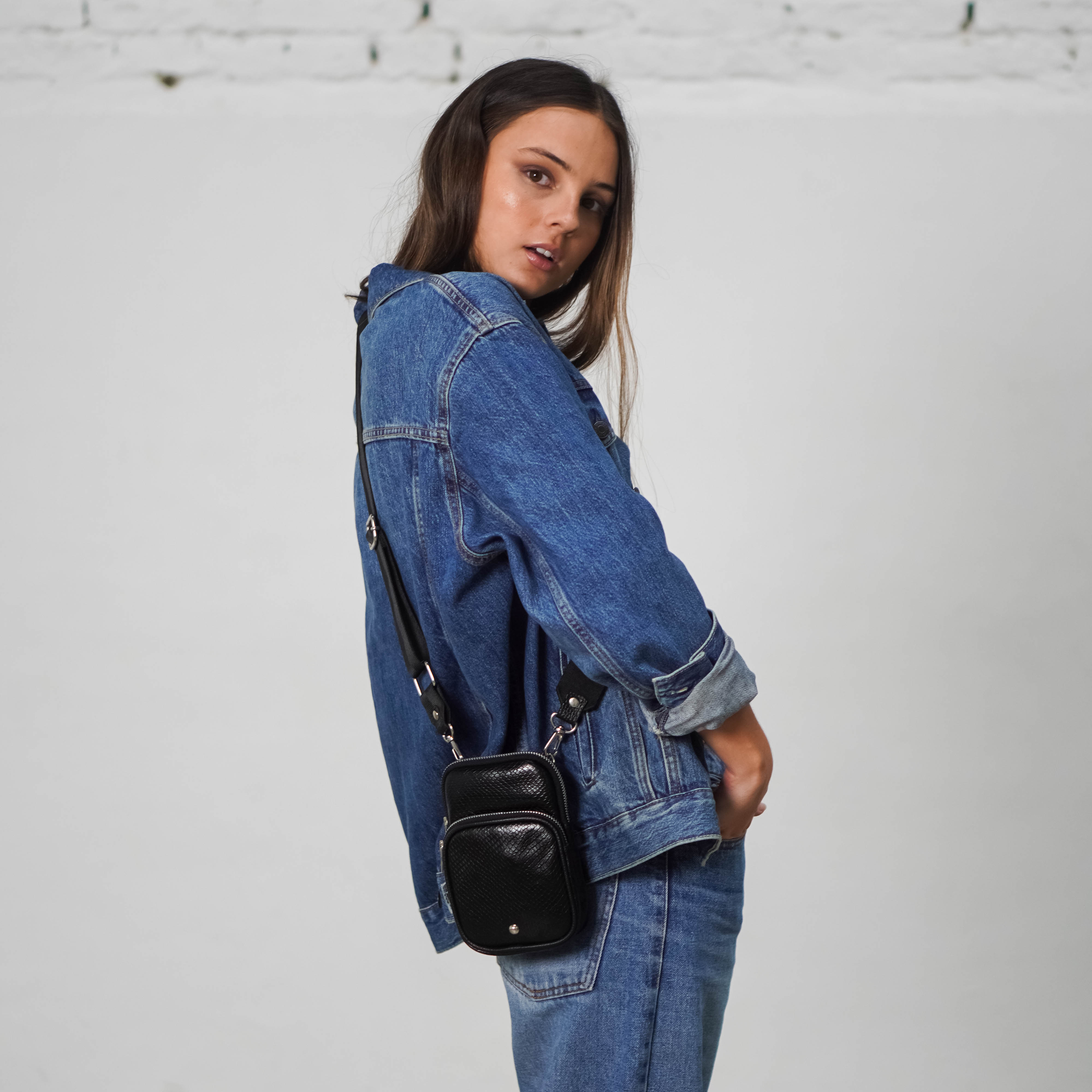 Bandolera porta celular de cuero negro